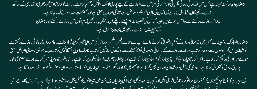 رمضان وہ بابرکت مہینہ ہے جس میں اللہ تعالیٰ روحانی، نفسیاتی اور جسمانی امراض سے شفا دینے کے لیے پوری لائف سٹائل کو منظم کرتا ہے۔رات کو نماز تراویح اورسحری وافطاری کے ساتھ روزے رکھنے کاایسا شیڈول بنایا ہے کہ انسان کی باڈی خودبخودامراض سے شفا کی طرف بڑھتی ہے اور جسم صحت مند ہونے لگ جاتا ہے۔