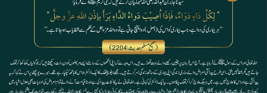 ’’ہر بیماری کی دوا ہے، جب بیماری کو اس کی (اصل )دواپہنچ جاتی ہے تووہ اللہ عزوجل کے حکم سے شفایاب ہوجاتا ہے۔‘‘