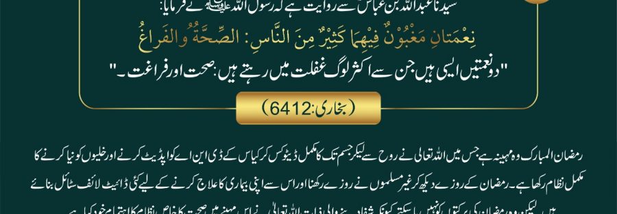 پس وہ خوش نصیب ہیں جوطب الہی کے لائف اسٹائل کی روشنی میں رمضان گزارتے ہیں۔ نماز تراویح اور روزے کے ساتھ روحانی صحت بناتے ہیں جبکہ سحری وافطاری میں صرف اللہ تعالیٰ کاپاکیزہ رزق کھاکردائمی بیماریوں سے نجات پاتے ہیں اور جسمانی صحت بڑھاتے ہیں ۔