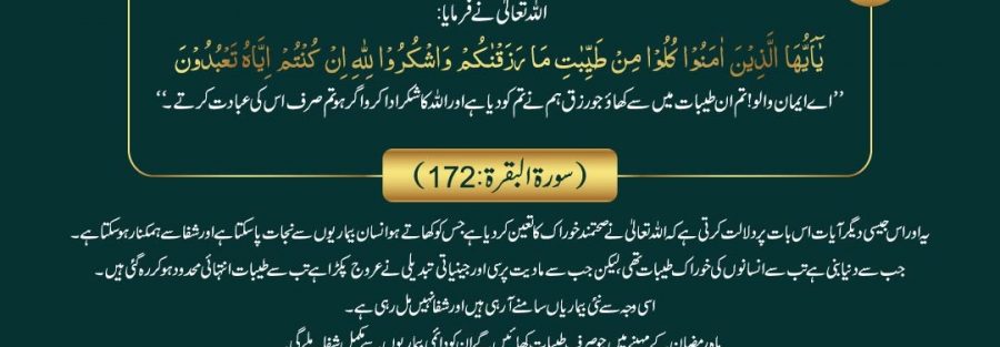 ’’اے ایمان والو!تم ان طیبات میں سے کھاؤ جو رزق ہم نے تم کو دیا ہے اور اللہ کا شکراداکرواگرہوتم صرف اس کی عبادت کرتے۔ ‘‘