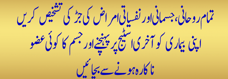 تمام روحانی، جسمانی اور نفسیاتی امراض کی جڑکی تشخیص کریں اپنی بیماری کو آخری اسٹیج پر پہنچنے اورجسم کا کوئی عضو ناکارہ ہونےسے بچائیں
