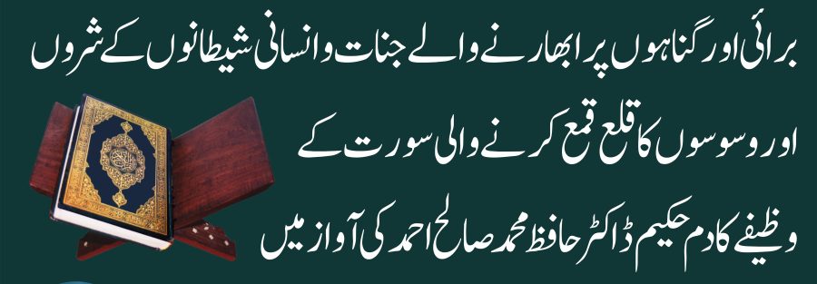 برائی اورگناہوں پر ابھارنے والے جنات و انسانی شیطانوں کا قلع قمع کرنے والی سورت کے وظیفے کا دم برائی اورگناہوں پر ابھارنے والے انسانی وجنات شیطانوں کے شروں اوروسوسوں کا قلع قمع کرنے والی سورۃ الناس کے وظیفے کا دم روحانی معالج تھراپسٹ حکیم ڈاکٹر حافظ محمد صالح احمد کی آواز میں