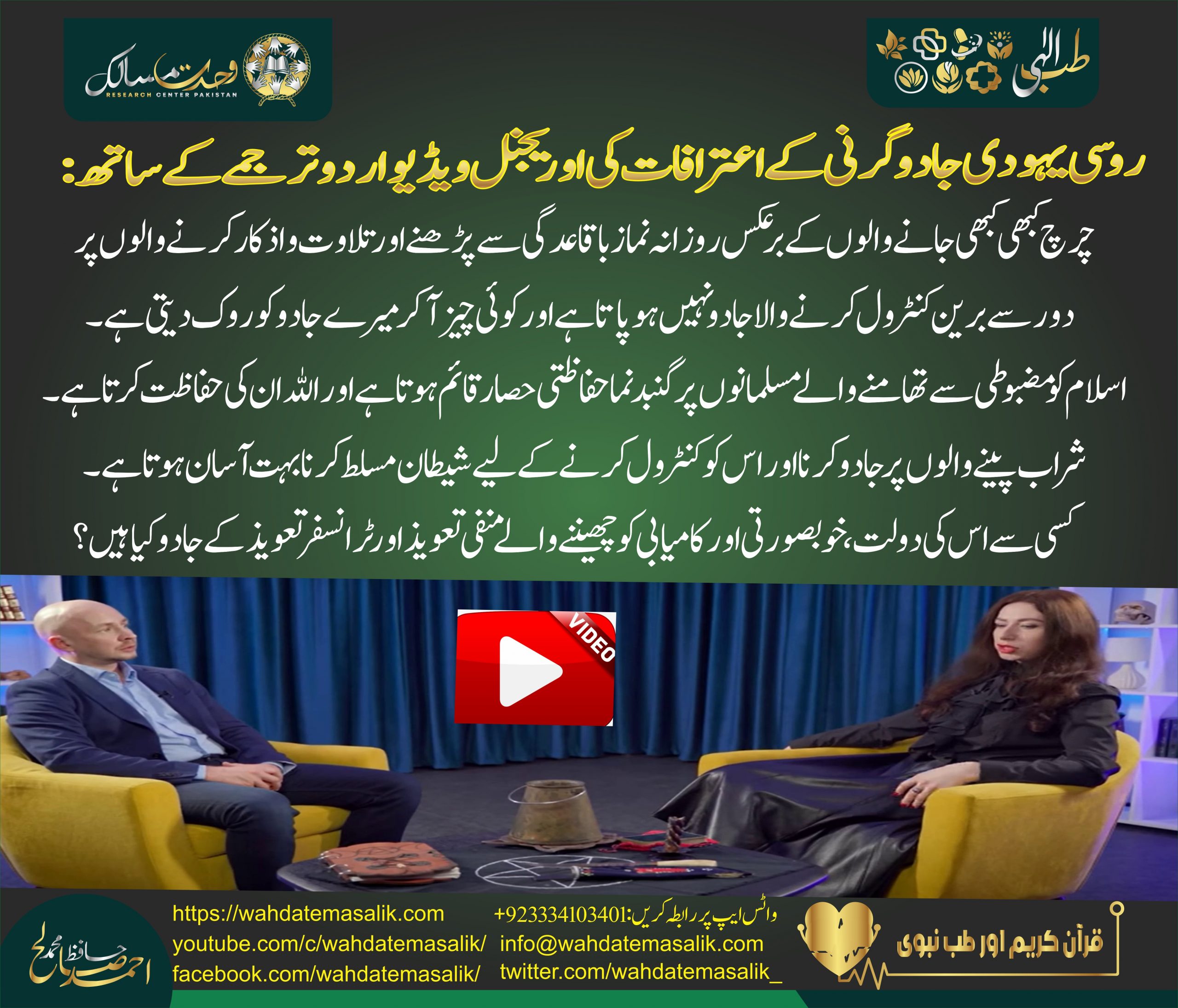 روسی یہودی جادوگرنی کے اعترافات کی اوریجنل ویڈیو: چرچ کبھی کبھی جانے والوں کے برعکس روزانہ نماز باقاعدگی سے پڑھنے اور تلاوت واذکار کرنے والوں پر دورسے برین کنٹرول کرنے والا جادونہیں ہوپاتاہے اورکوئی چیز آکرمیرے جادوکوروک دیتی ہے۔ اسلام کو مضبوطی سے تھامنے والے مسلمانوں پرگنبدنما حفاظتی حصارقائم ہوتا ہے اوراللہ ان کی حفاظت […]
