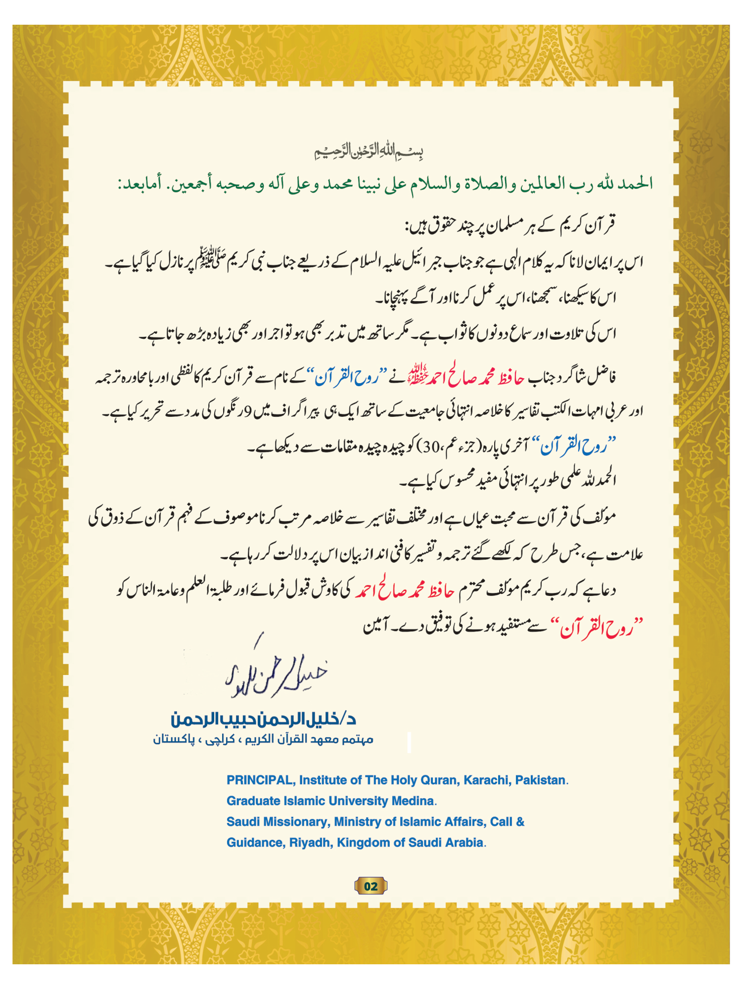 ’’ روح القرآن‘‘ آخری پارہ (جزء عم ، 30) کو چیدہ چیدہ مقامات سے دیکھا ہے۔ الحمدللہ علمی طور پر انتہائی مفید محسوس کیا ہے۔ مؤلف کی قرآن سے محبت عیاں ہے اور مختلف تفاسیر سے خلاصہ مرتب کرنا موصوف کے فہم قرآن کے ذوق کی علامت ہے، جس طرح کہ لکھے گئے ترجمہ وتفسیرکا فنی انداز بیان اس پر دلالت کررہا ہے۔