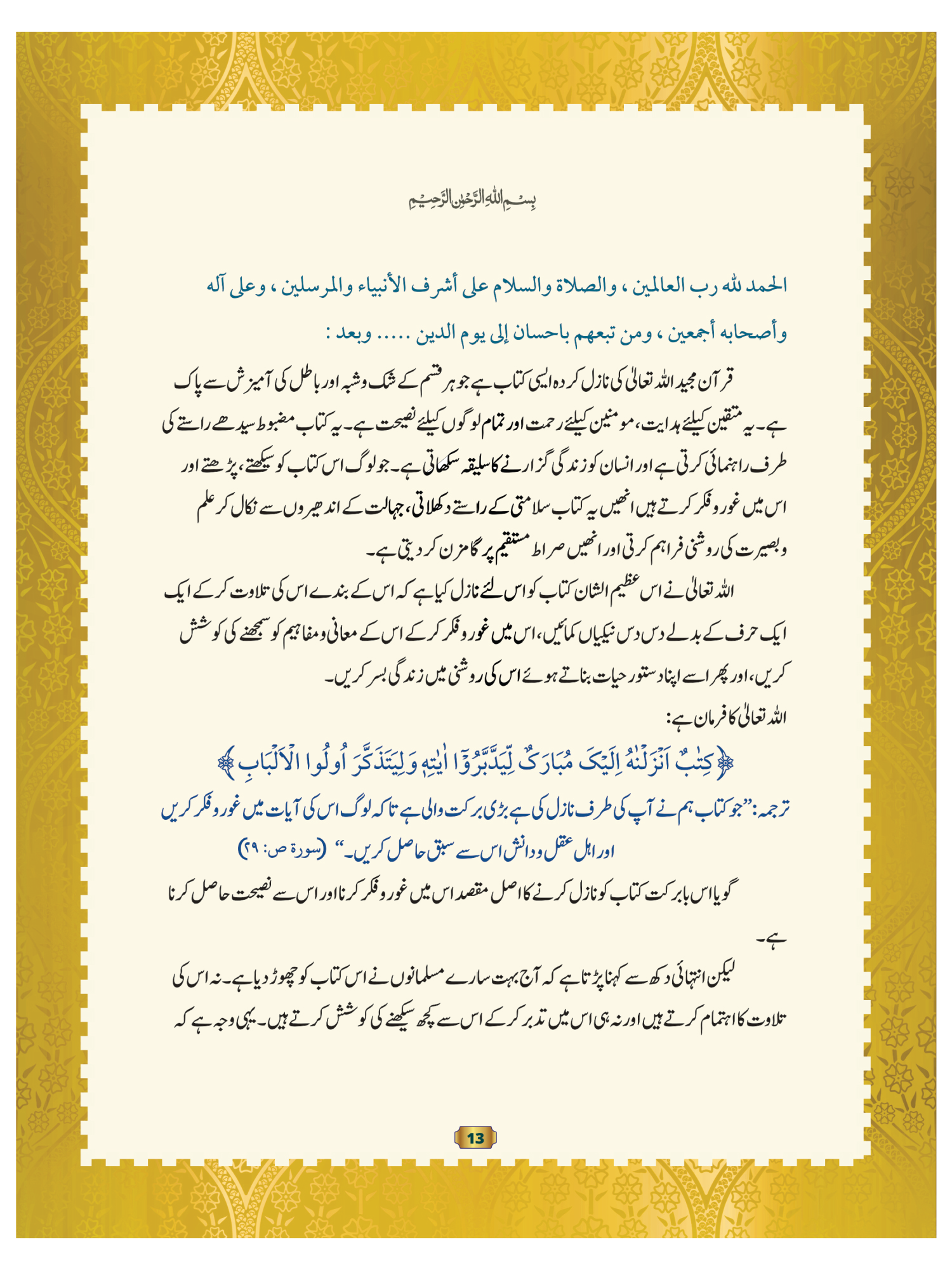 ترجمہ:’’جو کتاب ہم نے آپ کی طرف نازل کی ہے بڑی برکت والی ہے تاکہ لوگ اس کی آیات میں غور و فکر کریں اور اہل عقل و دانش اس سے سبق حاصل کریں۔‘‘