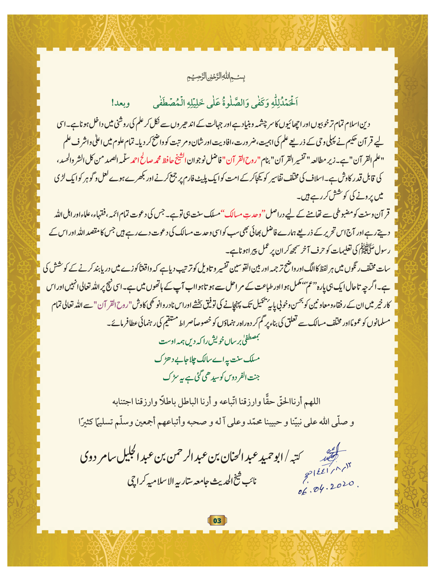 دین اسلام تمام تر خوبیوں اور اچھائیوں کا سرچشمہ وبنیادہےاور جہالت کے اندھیروں سے نکل کر علم کی روشنی میں داخل ہونا ہے۔اسی لیے قرآن حکیم نے پہلی وحی کے ذریعے علم کی اہمیت،ضرورت،افادیت اور شان و مرتبت کو واضح کر دیا۔تمام علوم میں اعلی و اشرف علم “علم القرآن “ہے۔زیر مطا لعہ ” تفسیرالقرآن ” بنام ” روح القرآن “فاضل نوجوان الشیخ حافظ محمد صالح احمد سلّمہ الصمد من کل الشر والحسد، کی قابل قدر کاوش ہے۔اسلاف کی مختلف تفاسیر کو یکجا کر کے امت کو ایک پلیٹ فارم پر جمع کرنے اور بکھرے ہوے لعل و گوہر کو ایک لڑی میں پرونے کی کوشش کر رہے ہیں۔