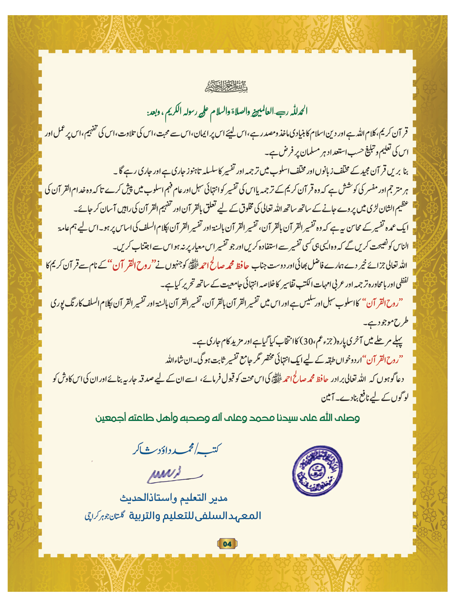 اللہ تعالی جزائے خیر دے ہمارے فاضل بھائی اور دوست جناب حافظ محمد صالح احمد حفظہ اللہ کو جنہوں نے ’’روح القرآن‘‘ کے نام سے قرآن کریم کا لفظی اور بامحاورہ ترجمہ اور عربی امہات الکتب تفاسیر کا خلاصہ انتہائی جامعیت کے ساتھ تحریر کیا ہے۔
